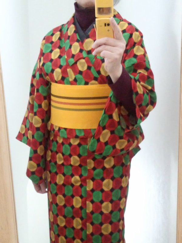 元気のいい派手系ウール絣は昨日の半幅と色合いピッタリ。目がチカチカする組み合わせなので半襟は墨黒で控えめ、帯に昨日の結び皺が少し残っていたので畳むだけでOKのカルタ結び。ごちゃつく気がして帯締めは無し。