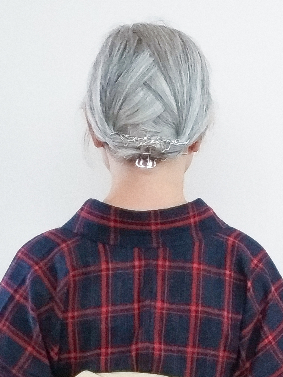 パッと見は編み込み?って感じですが、ジグザグに髪を分けてシリコンゴムで2つ結びにしただけ。左右それぞれの毛先を中央に向けてヘアクリップで留めたら完成。襟足の髪も2つ結びの方が落ちにくいし、低い位置にクリップを付けているので比較的スッキリまとまった感じ。
