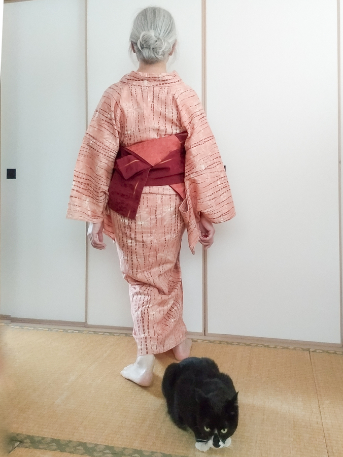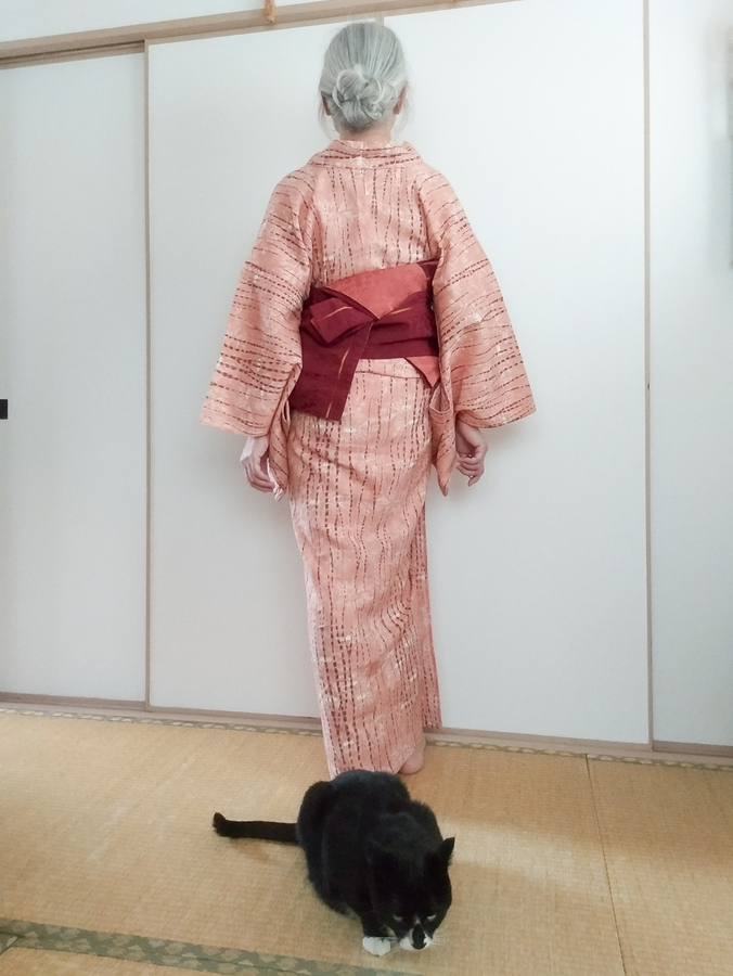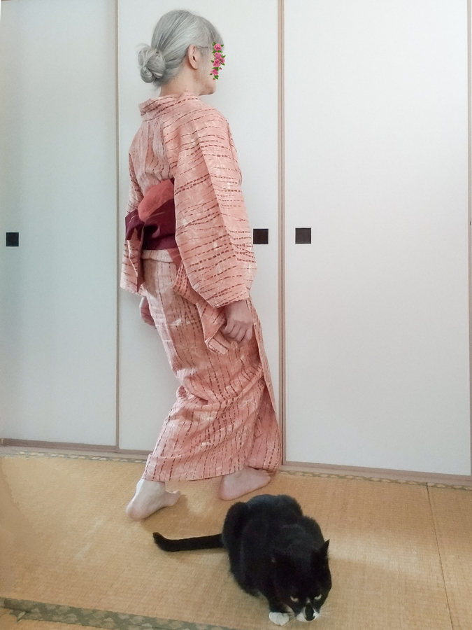 着替え直した時は急いでいて(ちゅーるを垂らした浴衣を早く洗う必要があった)、猫さんはリビングに居て貰ったせいか、1日過ごした後のお着替えは一緒に来て着画にもしっかり参加。お着替えに付き合うとちゅーるが貰えるって認識なのかも?(既におやつを食べたので残念ながらこの時はちゅーるは無し)